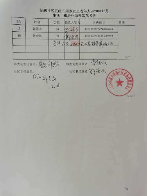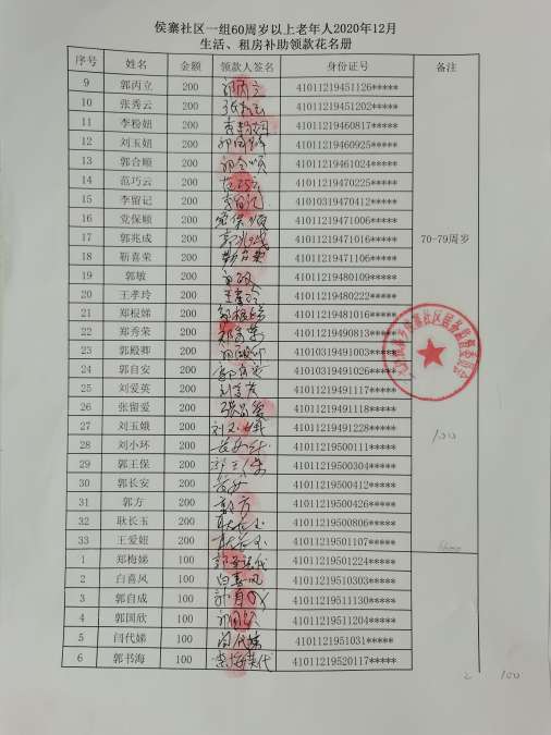侯寨社区“孝老敬亲”2020年12月份租房补助领取公示表