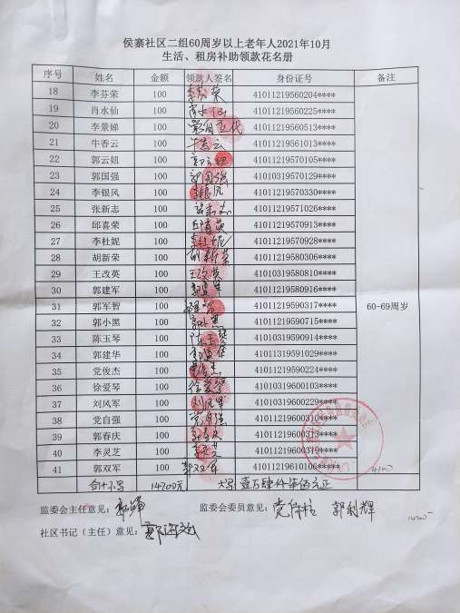 侯寨社区“孝老敬亲”2021年10月份租房补助领取公示表