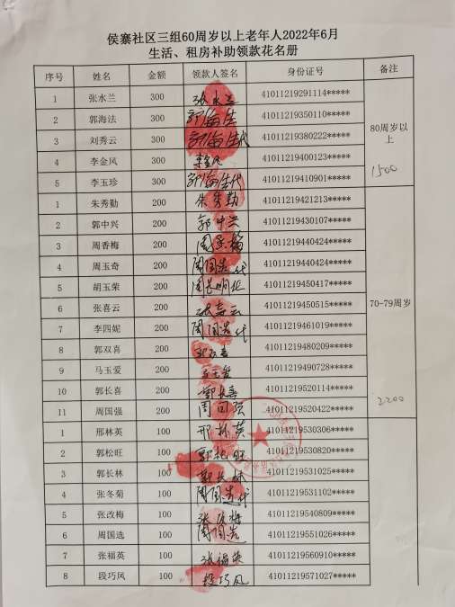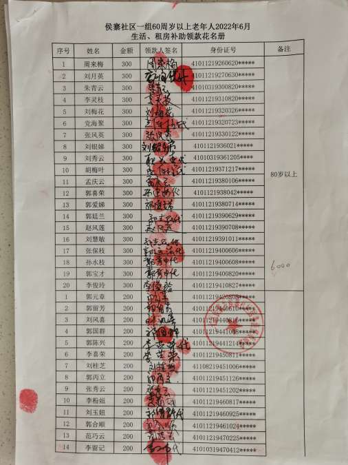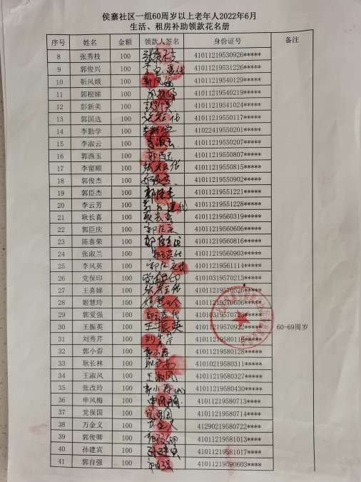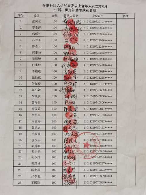 侯寨社区“孝老敬亲”2022年6月份租房补助领取公示表
